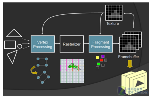 下面以OpenGL为例说明。接口封装层调用OpenGL glDrawArray绘制矩形,之后在渲染流水线中完成顶点变换、光栅化和着色,最后送帧缓冲显示。渲染流水线如下图所示: