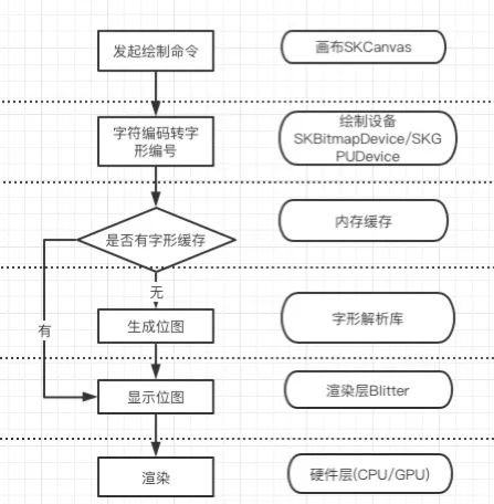 点阵字体最后解析成了位图,然后根据平台不同选用CPU或者GPU渲染出来。Skia为了提高字体显示速度,对字体的解析结果做了内存缓存。