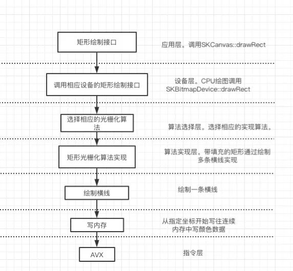 由于选择的是CPU渲染模式,故调用SKBitmapDevice的矩形绘图函数drawRect实现。