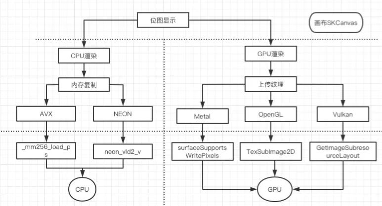 skia提供了showBitmap函数可直接显示位图。位图渲染模式跟矢量图形类似,分为CPU渲染和GPU渲染。位图的CPU渲染跟实心矩形的渲染原理类似,通过SIMD指令集将位图内存一行一行拷贝到指定内存缓存中。GPU渲染模式通过调用OpenGL、Metal、vulkan的纹理贴图函数实现。