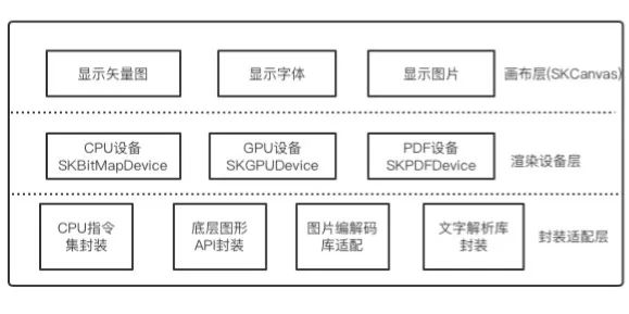 Skia在结构上大致分成三层:画布层,渲染设备层和封装适配层。