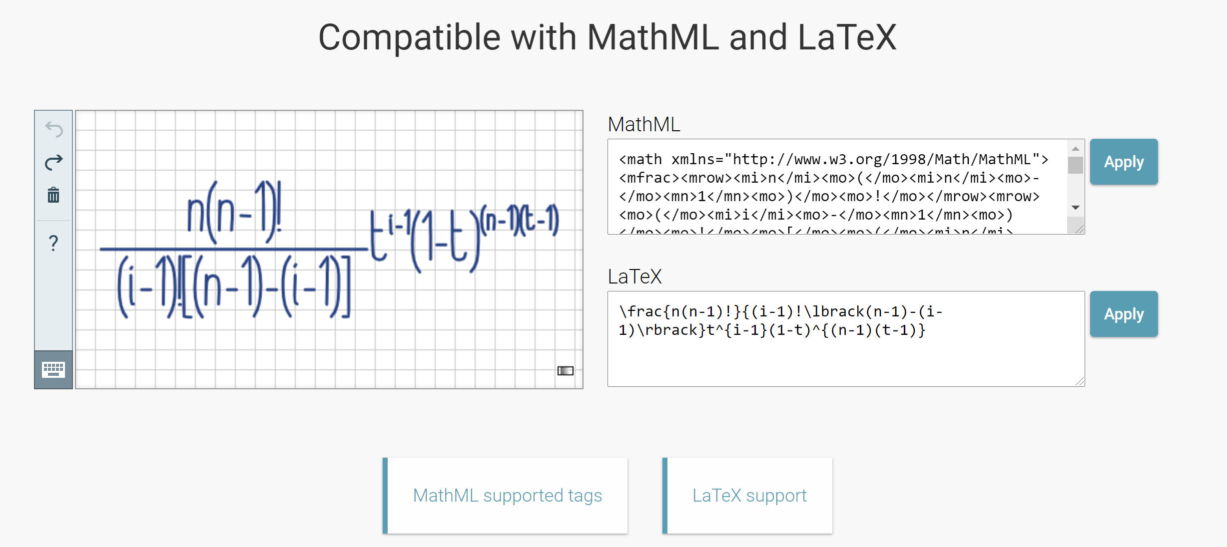 像这样的公式: $$\frac{n(n-1)!}{(i-1)![(n-1)-(i-1)]}t^{i-1}(1-t)^{(n-1)(t-1)}$$ 想要正确地写出它的文本形式可不容易: