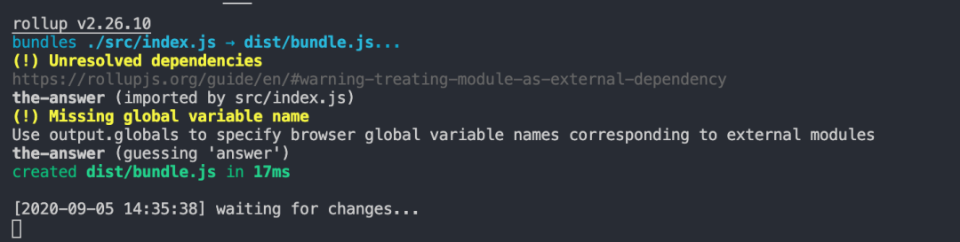 bundle.js仍然会在Node.js中工作,但是the-answer不包含在包中。为了解决这个问题,将我们编写的源码与依赖的第三方库进行合并,rollup.js为我们提供了resolve插件。