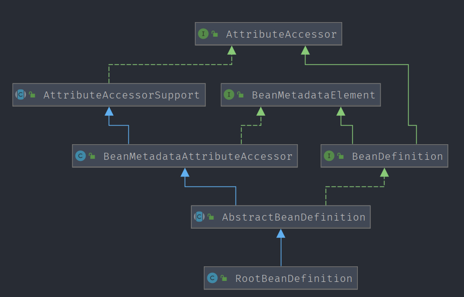 SpringIOC 容器管理了我们定义的各种 Bean 对象及其相互的关系,Bean 对象在 Spring 实现中是以 BeanDefinition 来描述的,其继承体系如下:
