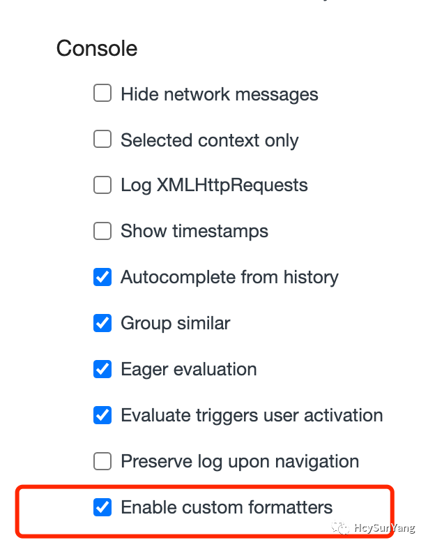 可以发现非常的不直观,当然我们可以直接打印 count.value ,这样就只会输出 0,但是有没有办法在打印 count 的时候让输出的信息更有好呢?当然可以,浏览允许我们编写自定义的 formatter,从而自定义输出的形式。在 Vue 的源码中你可以搜索到名为 initCustomFormatter 的函数,这个函数就是用来在开发环境下初始化自定义 formatter 的,以 chrome 为例我们可以打开 devtool 的设置,然后勾选 Console -> Enable custom formatters: