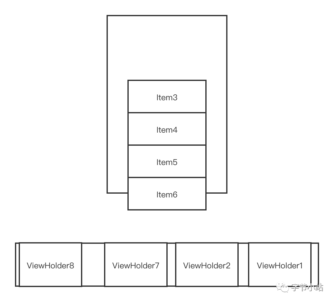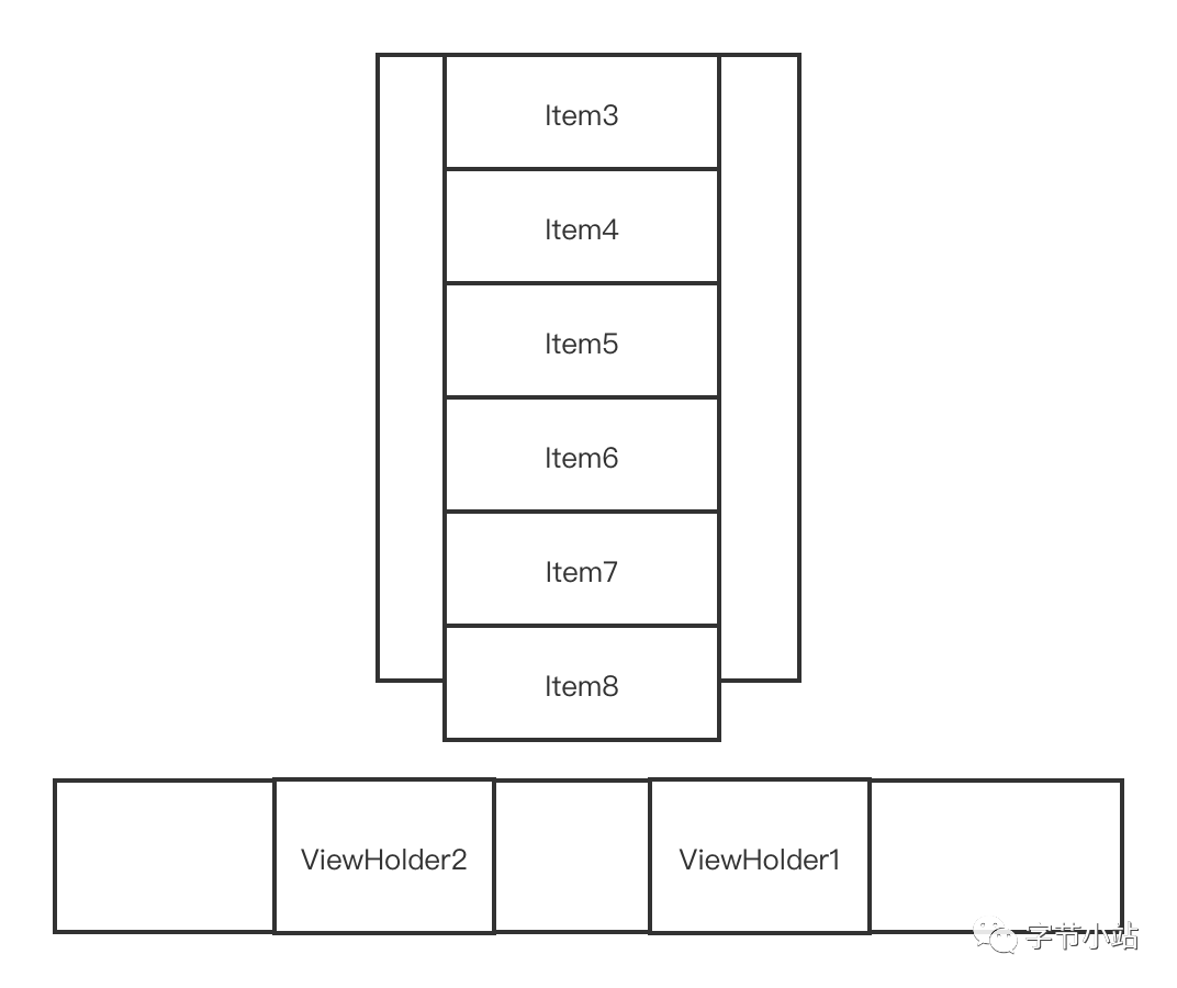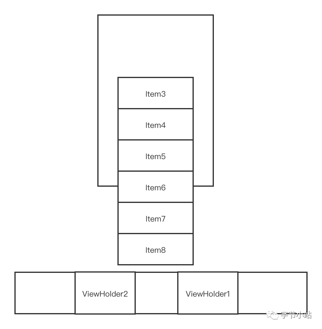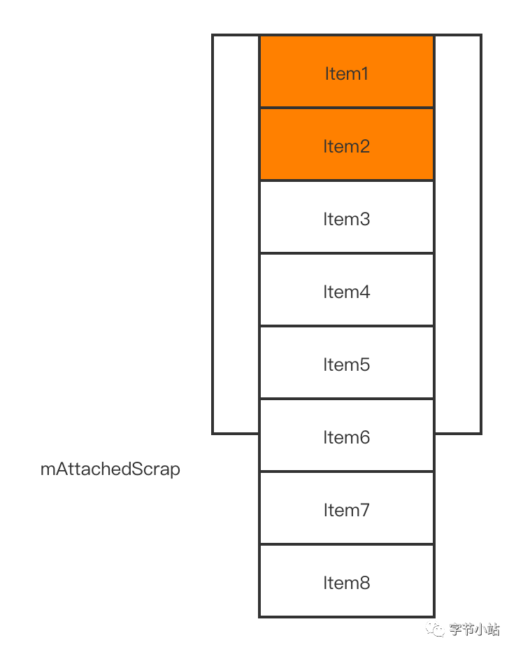 从锚点Item3处往下填充,填充到Item6为止,就没有足够的距离了,mAttachedScrap只剩下ViewHolder8,ViewHolder7,ViewHolder2,ViewHolder1