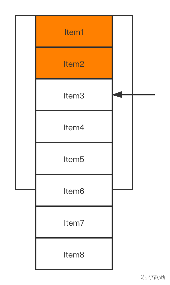 从锚点Item3处往上填充Item2 Item1,因为Item2,Imte1已经被remove掉了,它消耗的空间不会被记录,那么到步骤5的时候还可以填充