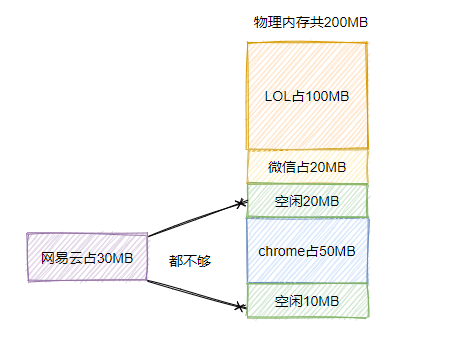 假设此时你有 200M 内存,此时有 3 个应用在运行,分别是 LOL、chrome、微信。