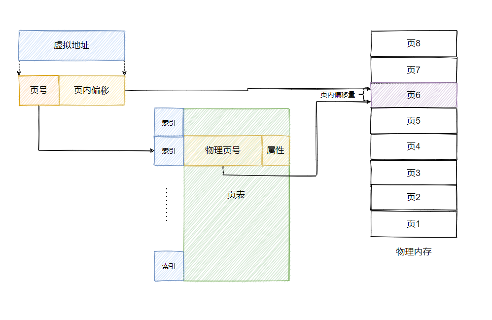 再具体一点就是每个进程都有一个页表,页表中有物理页号和属性,这样寻址的时候通过页表就能利用虚拟地址找到对应的物理地址。