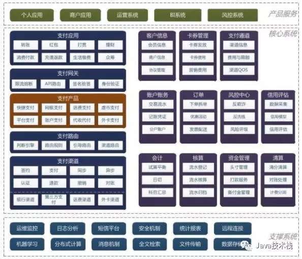支撑系统、核心系统和服务系统,在每个互联网公司的架构上都是大同小异的,都是必不可少的模块。而支付应用是每个公司根据自己的业务来构建的,各不相同。