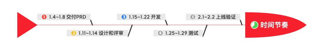 描述:这个时间节奏的定义非常重要,它可以是项目经理发起也可以是产品发起。一般很多时候互联公司发一个项目,经常会听到老板说 我要这个时间上。可能这句话看上去很不合理,但为了活下去,为了快速站住市场,压到下面执行人员就是一个必须要上线的时间。 但,这个上线的时间如果想满足, 那么就需要把整体的时间节奏确认出来。比如业务和产品什么时候把需求确认清楚,什么时间与研发过PRD,研发什么时候开发到提测,测试什么时间测试完成。 如果,没有这个时间节奏,前面的职责人员把时间都耗费没了以后,越往后面风险越高。 就像最后研发只有4天,测试只有2天,那带BUG上线吗!?所以要整体把控才是对项目的负责。