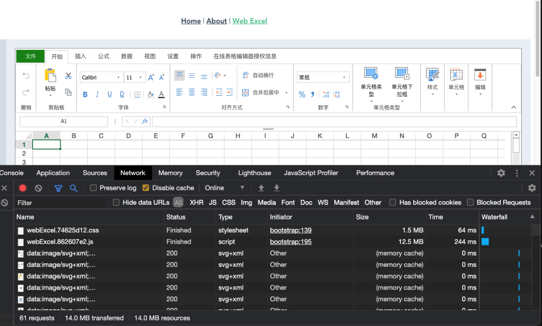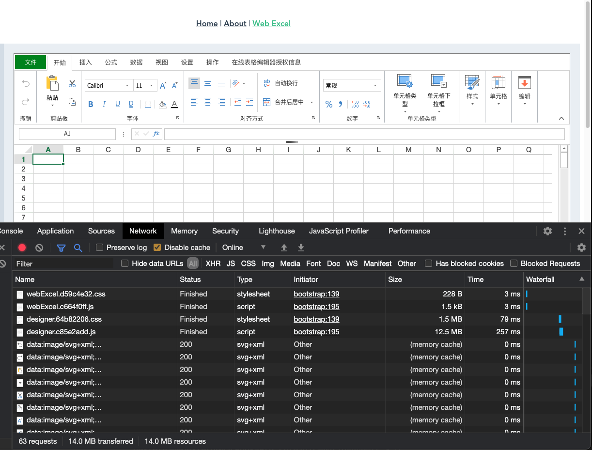 清理网络请求记录,点击Web Excel,访问webExcel页面,此时会请求webExcel资源并展示组件。