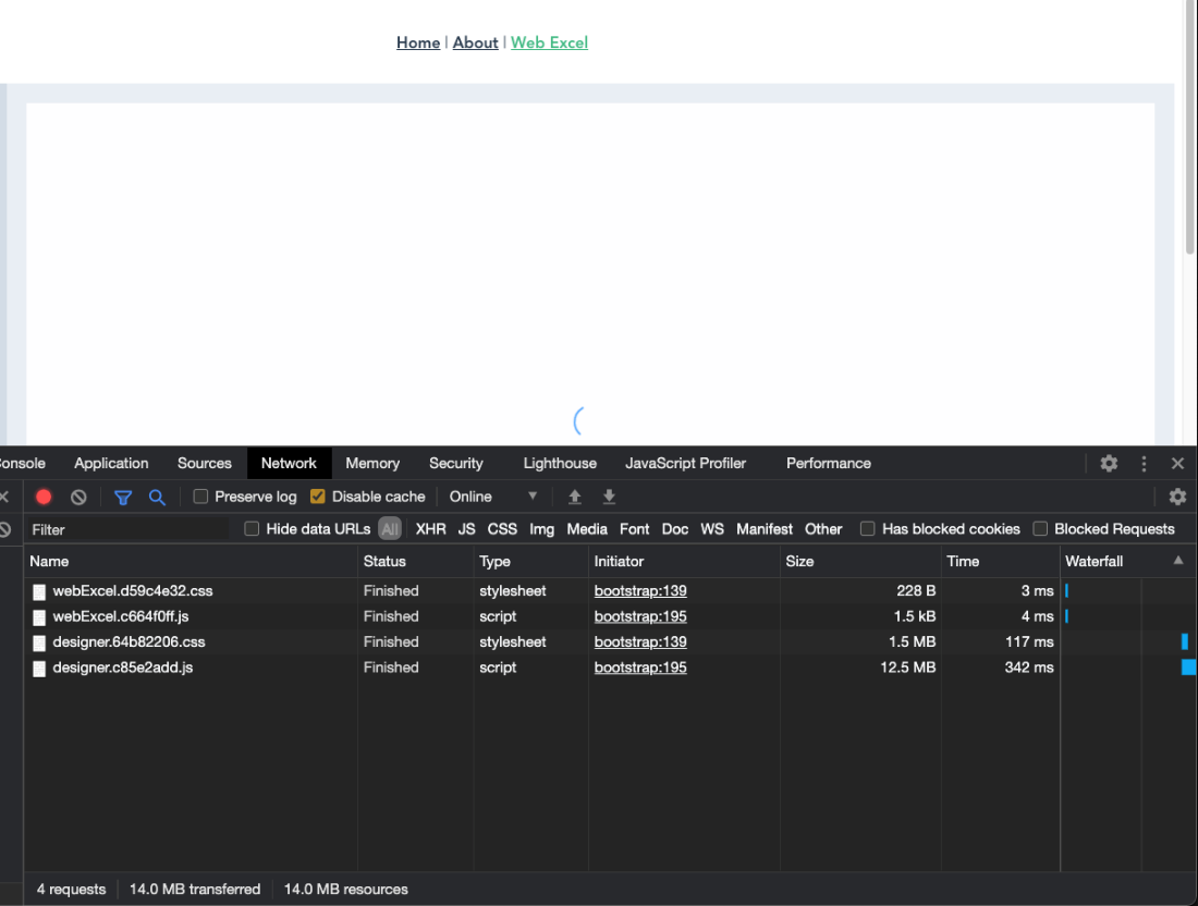 可以从网络请求中看到,webExcel加载完3秒后开始请求designer资源,请求时显示LoadingComponent,请求完毕展示Desinger 组件。