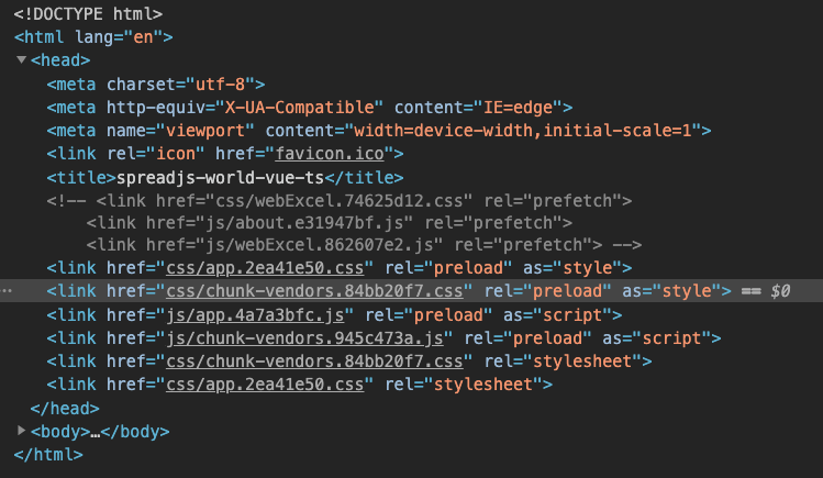 打包发布访问页面,首屏秒开,直接访问about依旧秒开。可是查看网络请求时候发现访问首页时请求了about和web Excel的资源。经过排查发现vue-cli在页面中使用了preload和prefetch预加载机制,在不影响当前页面加载的情况下预加载后续页面需要的资源提升用户体验,这里为了演示清晰注释掉prefetch的资源。