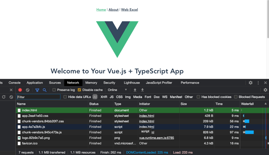 通过路由异步加载模块,加速首屏以及其他页面加载速度,在Vue Router中将webExcel模块配置为懒加载模式,配置后webExcel组件会按照指定的webpackChunkName打包为单独的文件,并在访问webExcel路由的时候才会加载。这样访问home以及about页面时并不会加载webExcel资源。