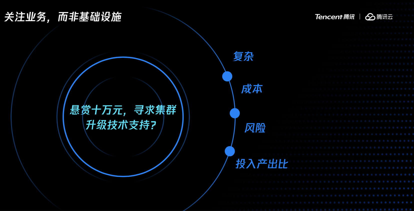 接收到这个求助之后,我们跟客户介绍了TKE的技术方案,整个升级过程需要做大量前置校验工作,并且还要针对不同的K8s版本做patch、以及适配不同的Linux发行版等,这些工作在客户的环境里实现起来工作量太大,成本太高。K8s集群的维护是很复杂的,他介于IaaS跟PaaS之间,需要针对Linux内核、K8s内核以及依赖的网络、存储、计算资源做大量的优化,才能保证集群稳定、高效运行。对团队来说,需要招聘业界顶级专家,否则当集群功能异常无法解决,可能造成业务大面积受损。