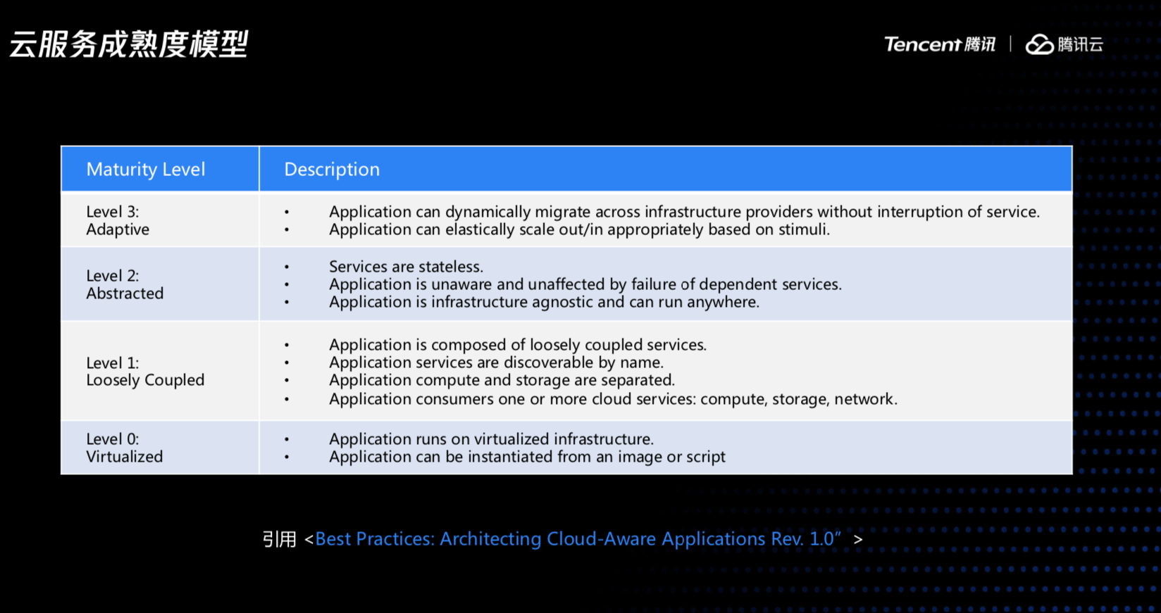 最后给大家介绍下,其他的业界专家提供的,怎么从个人的环境里面的服务迁移到公有云上,他总结了一些必要的步骤,和上云的一个成熟度模型,同时还有我们怎么样去验证我们的业务系统是不是一个服务云原生架构的系统,他提了很多问题,根据这些问题来检验我们的系统是否符合云原生架构。由于演讲时间已经超过了预定的15分钟,这里就不一条条来过了,感兴趣的同学可以下来参考原始的资料,相信大家会有收获。