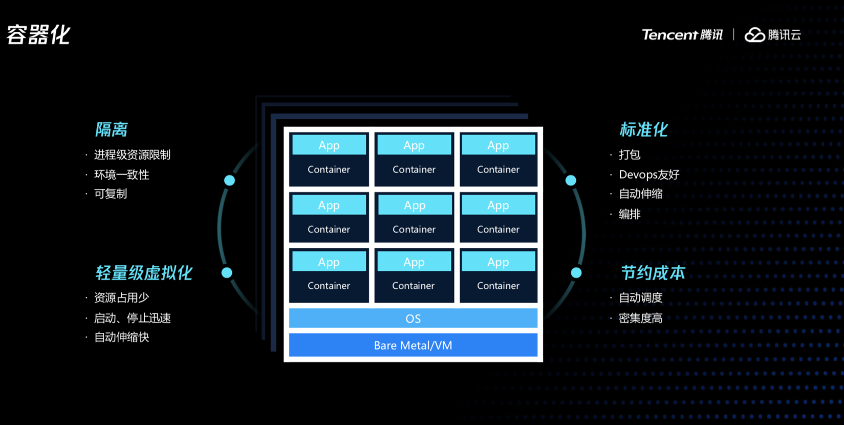 有人说没有集装箱就没有全球化,这里的容器就是集装箱,大家想是不是这个道理。容器还有很多优点,首先可以降低成本,K8s知道如何调度把容器到合适的机器上,使得集群节点使用率均衡、并且提高节点的资源使用率,可运维性也上来了。