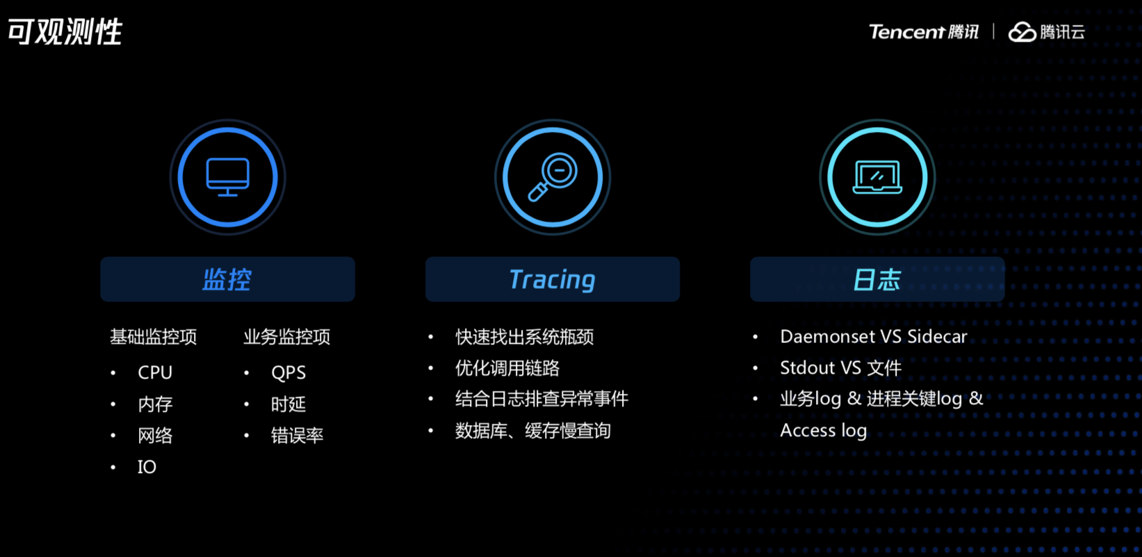 对于监控,我们需要同时做好基础监控以及业务监控,容器的CPU、内存、网络、各种句柄等,业务层面,我们需要监控业务的服务质量,比较常见的就是业务的响应时间、错误率等。
