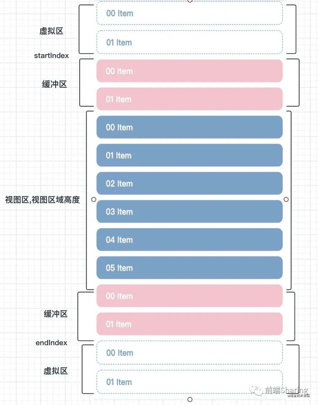 为了防止大量dom存在影响性能,我们只对,渲染区和缓冲区的数据做渲染,,虚拟列表区 没有真实的dom存在。缓冲区的作用就是防止快速下滑或者上滑过程中,会有空白的现象。