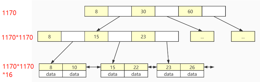 在Innodb中,默认的innodb_page_size大小为16kb,这就相当于上面每一个节点的大小默认情况下是16kb。一个索引值的大小为8B,索引后的指针所占大小为4B,因此可以解算出一个节点中大约可以存储1170个索引。