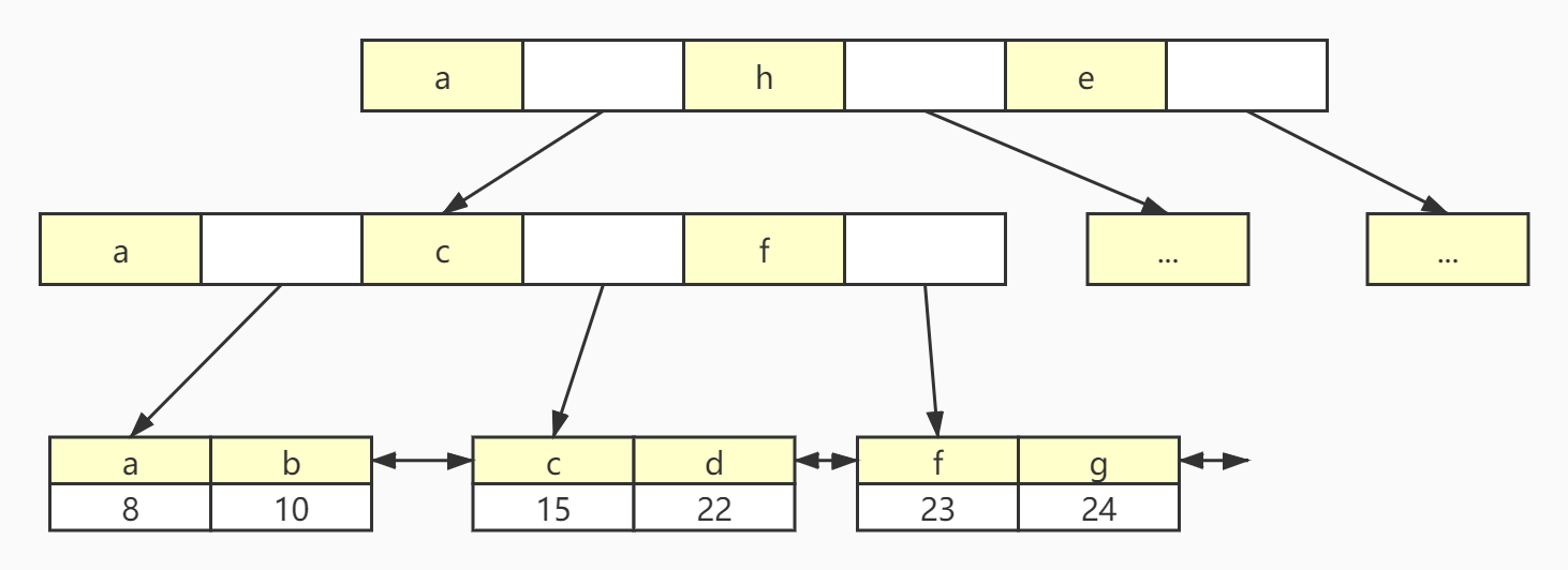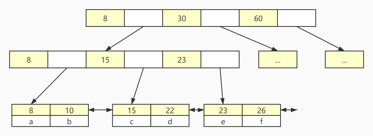 B+树的数据结构如图所示,首先非叶子节点只存储索引,且每个指针所指向的节点最左边的索引都是该指针对应的索引值,比如头节点的第一个索引值8,指向的非叶子节点的第一个索引值也是8。
