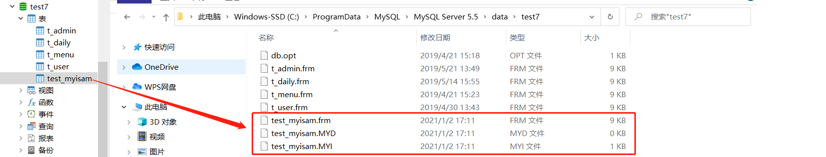 Myisam索引文件和数据文件是分离的,在MyIsam存储引擎中,新建一张表后会在磁盘中增加三个文件:
