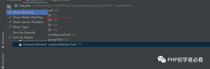 这个功能会显示出这个文件中所有的语法错误、未使用的变量、未使用的文件都会分析出来。
