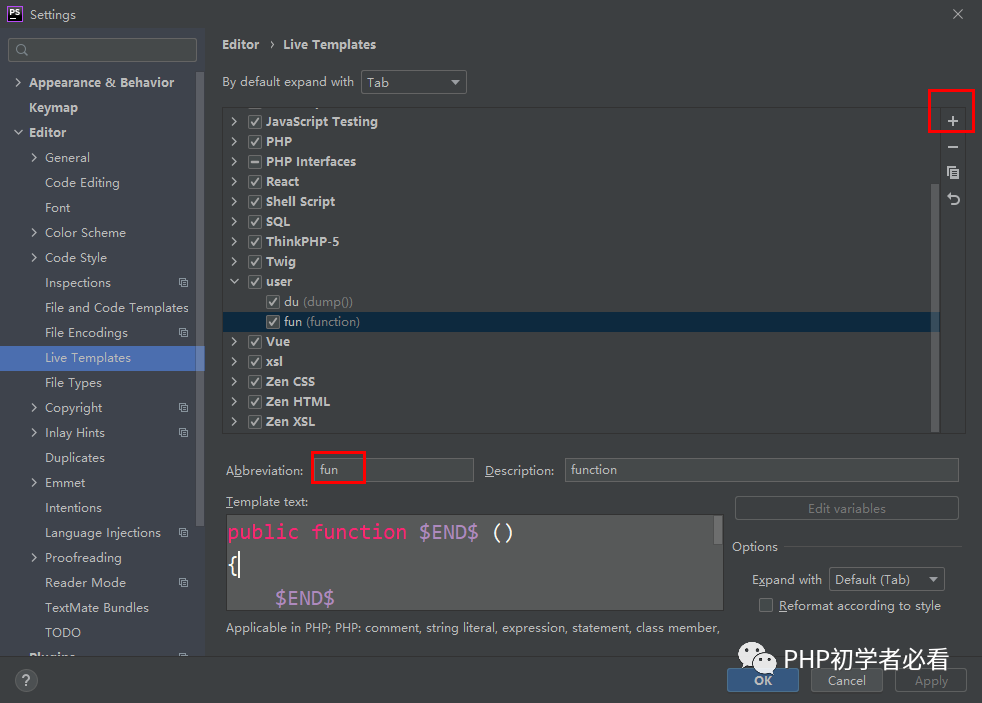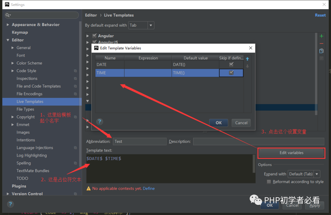 找到右边有个+号,创建一个自定义模板:选择Live Template,然后按照下图的配置顺序进行设置: