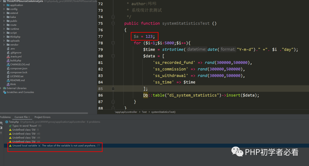 大家也能看到上边有四条错误信息,都是未定义类Db,在thinkphp5.1中给Db类注册了门面类,但是编辑器还是没有识别到。