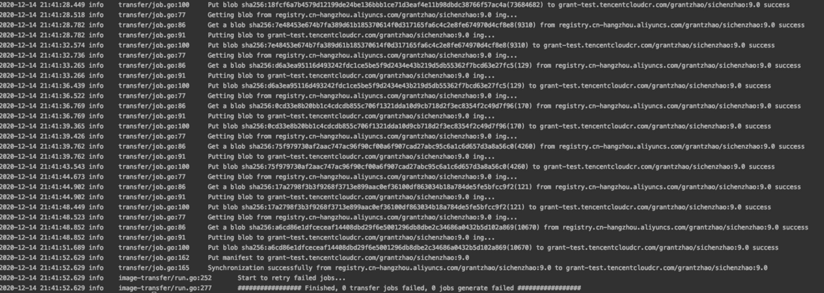 最后可以看到,有 16 个 job 失败了。工具最后会列出失败的 job 的源镜像地址和目的镜像地址。对于这些失败的 job,去仓库检查后发现,这些 job 的 tag 是失效的。因此传输失败。