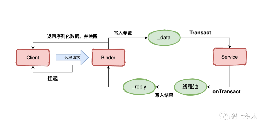 然后Binder驱动把对应的数据交给服务器端,等结果计算好之后,再由Binder驱动把数据返回给客户端。