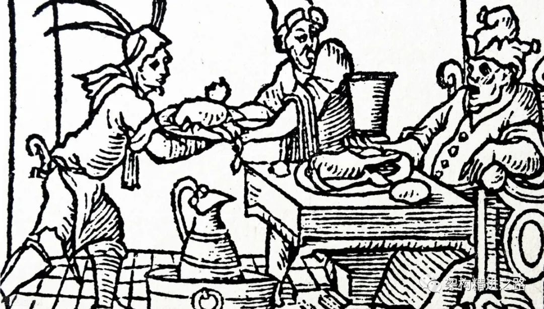 木刻,描述一个贪婪的人会吃大量的食物