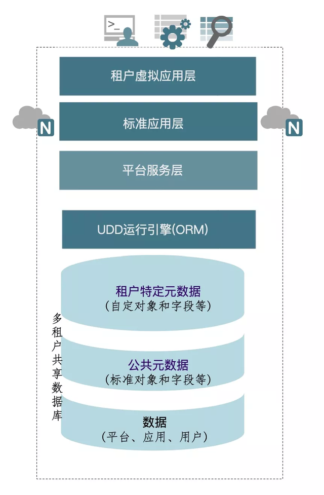 - 通用数据字典 UDD(Universal Data Dictionary) 运行引擎层实现了应用对象到底层数据存储的映射,包含对象模型操作、SOQL 语言解析、查询优化,全文搜索等功能,我们常说的 ORM 功能也是其核心功能,但比其复杂的多。