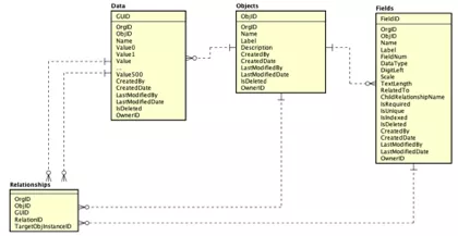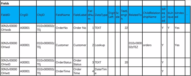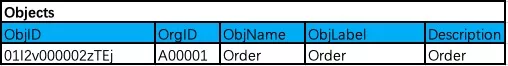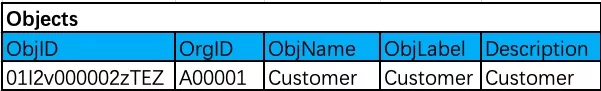 元数据表用于存放系统标准对象以及用户自定义对象和字段定义的元数据,也就是系统和用户对象的逻辑结构,即对应于关系数据库中的虚拟表结构。元数据表主要包括Objects 表以及 Fields 表,是系统标准对象和用户对象定义数据的仓库,即元数据仓库。