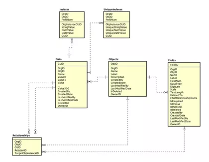Salesforce 云服务平台遵循的是面向对象的设计理念,所有的实体、实体关系以及实体的 CRUD 均是以对象的视角进行的,所以其元数据驱动的多租户数据模型的存储基本元素也是按照对象的颗粒度进行存储,源自于 OO 的对象间引用,同普通关系数据库主外键关系异曲同工,只是细节处理上不尽相同,请大家注意这一点。