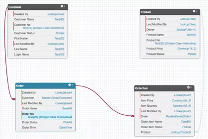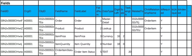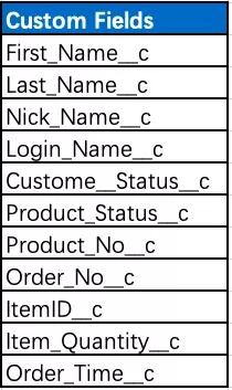 - Ordernoc,customerc,orderstatusc,ordertimec 为用户自定义字段,这里需要说明的是 customer__c 自定义字段存储的是父对象实例 ID