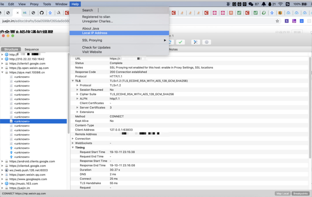 然后找到Charles的help/Local IP Address,点击它就会看到自己的本机地址,找到本机地址记下来,然后进行下一步