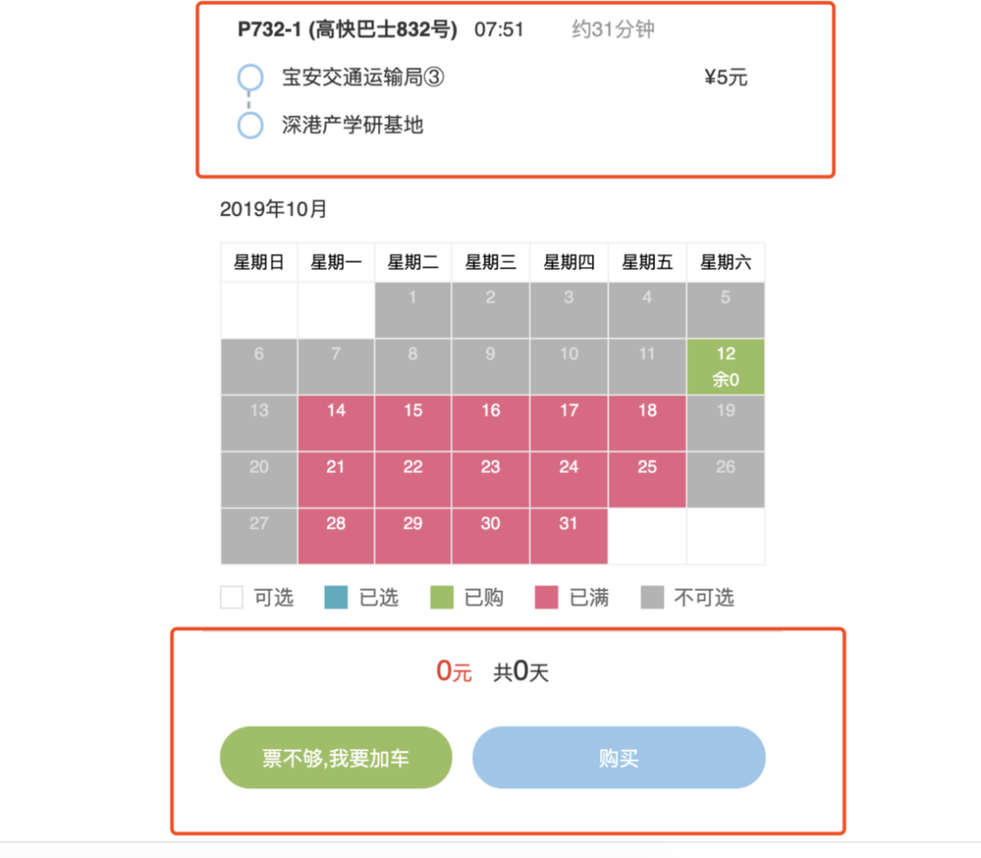这个就是订票页面,显示当前月的车票情况,根据图示,红色为已满,绿色为已购,灰色为不可选