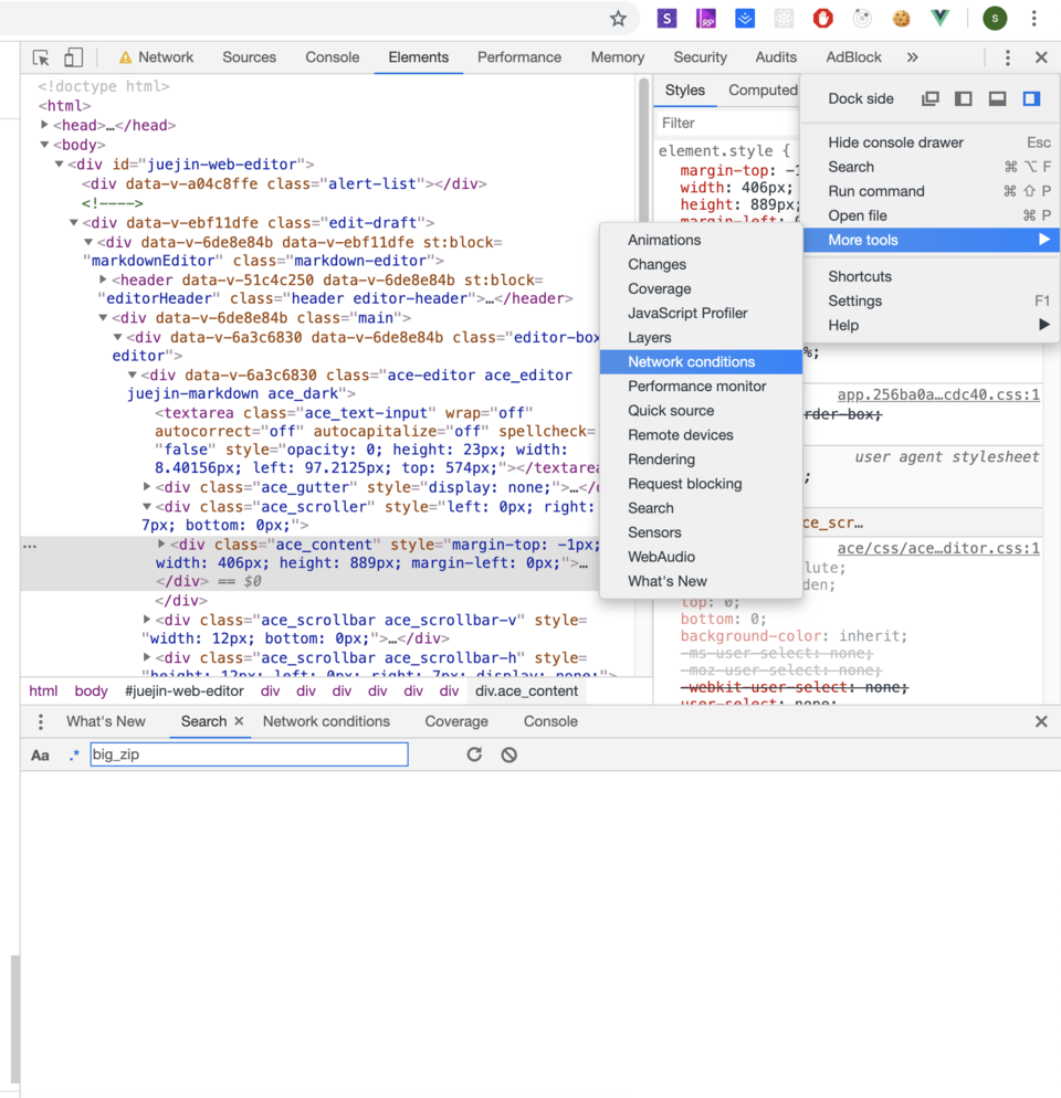 有以上信息后,我们就可以开始用chrome调试了, 首先打开More tools/Network conditions