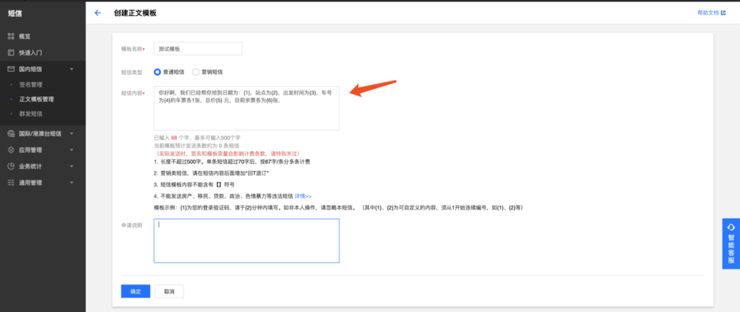 let smsSign = "测试短信"; // NOTE: 签名参数使用的是`签名内容`,而不是`签名ID`。这里的签名"腾讯云"只是示例,真实的签名需要在短信控制台申请