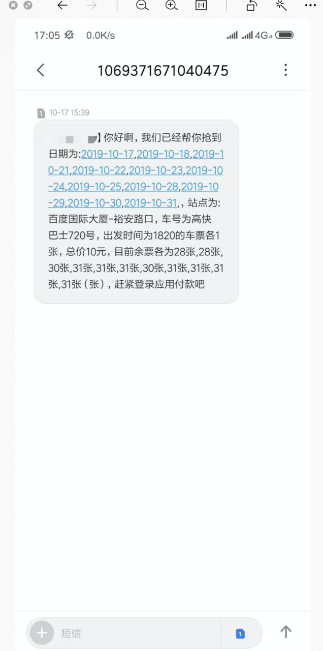 但是呢,票经常会被抢光,同时我还我发现,有时候会有人退票,这时候就有空余票了,关键是我不可能时时都在公众号上盯着,于是,我就写了一个抢票+短信通知的小工具