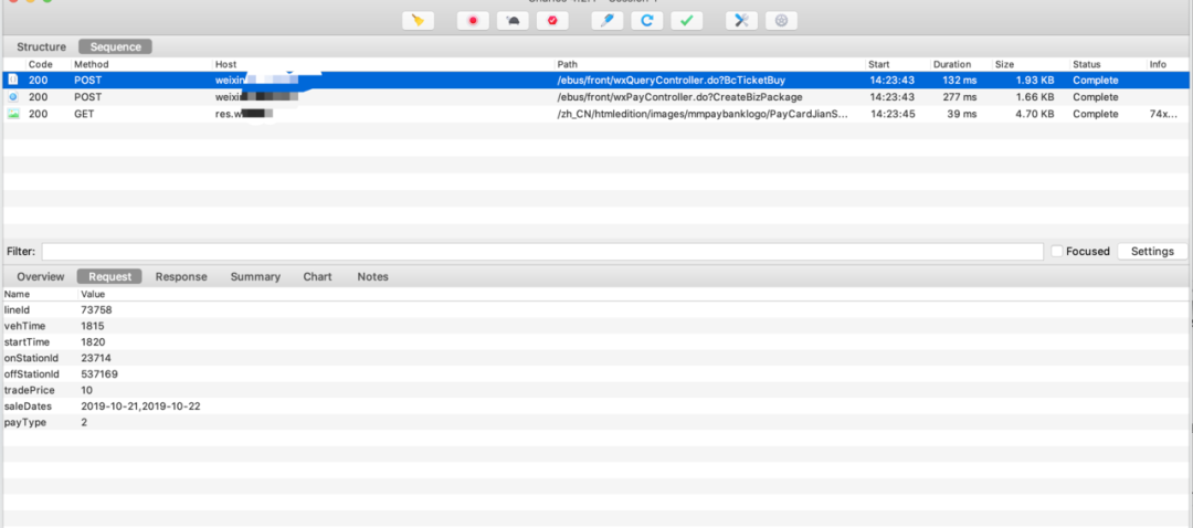 我们用手机访问微信公众号【xxxx】进入到抢票页面后,发现Charles已经成功抓包到了网页信息,当我们进入这个抢票页面的时候,他会发起两个请求,一个是获取document文档内容,一个post请求获取票务信息。