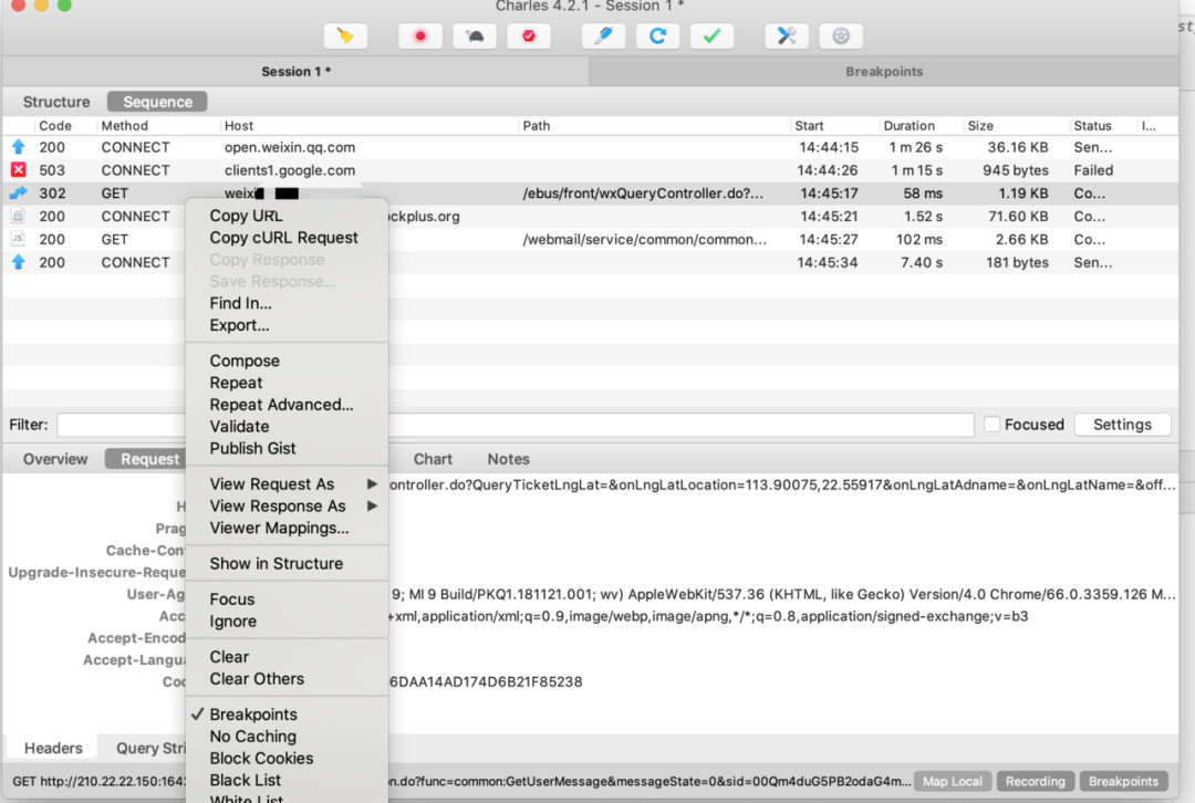 打开chrome访问目标网址,我们可以看到Charles上已经抓包到了我们访问的目标url地址,然后给目标url地址打上断点,方便调试