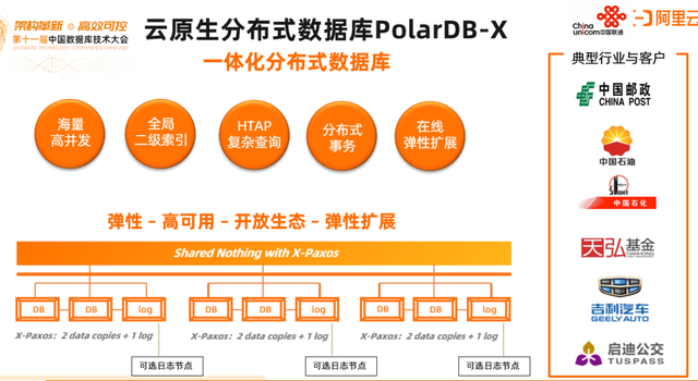 分布式版本的PolarDB-X:基于X-DB以及原来的分库分表DRDS将二者合二为一成为一个透明的一体化分布式数据库PolarDB-X。每个分布式节点包括两个数据节点、一个日志节点,通过优化Paxos确保数据节点和日志节点的数据一致性。