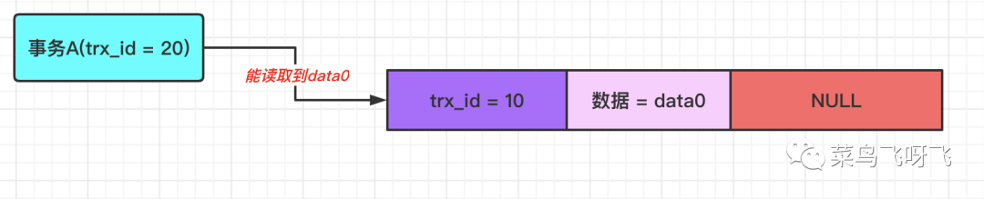 此时由于数据的最新版本的 row_trx_id=10,「小于事务 A 的 ReadView 中的 min_trx_id,这表明这个版本的数据是在事务 A 开启之前就提交的」,因此事务 A 可以读取到数据,读取到的值为 data0。