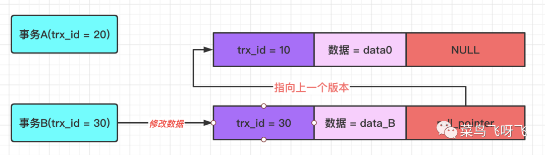 接着事务 B(trx_id=30)去修改数据,将数据修改为 data_B,并提交事务,此时 MySQL 会写一条对应的 undo log,数据就会新增一个版本,undo log 版本就变成了如下图所示的结构,数据的最新版本的 row_trx_id 就是事务 B 的事务 id,即:30。