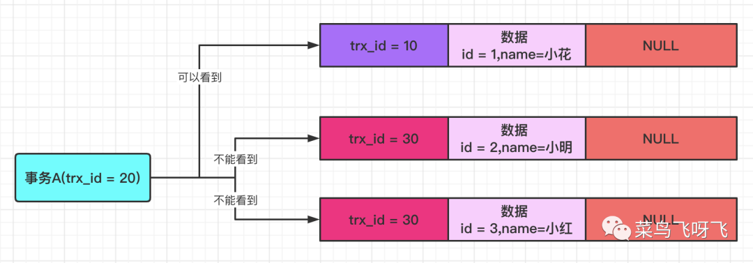 同理,id=3 的这条数据,trx_id 也为 30,因此也不能被事务 A 看见。