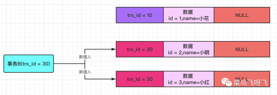 接着事务 B(trx_id=30),往表 t 中新插入两条数据,SQL 语句如下。