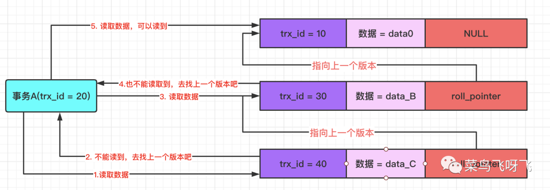 由于数据最新的版本的为 trx_id=40,依照 ReadView 机制,40 大于事务 A 中的 max_trx_id,「这表示这是在事务 A 开启之后的事务提交的数据,因此事务 A 不能读取到」,所以需要沿着 undo log 版本链往前找,然而 trx_id=30 的版本事务 A 也不能读到,继续向前找,最终读取到 trx_id=10 的版本数据,即 data0。